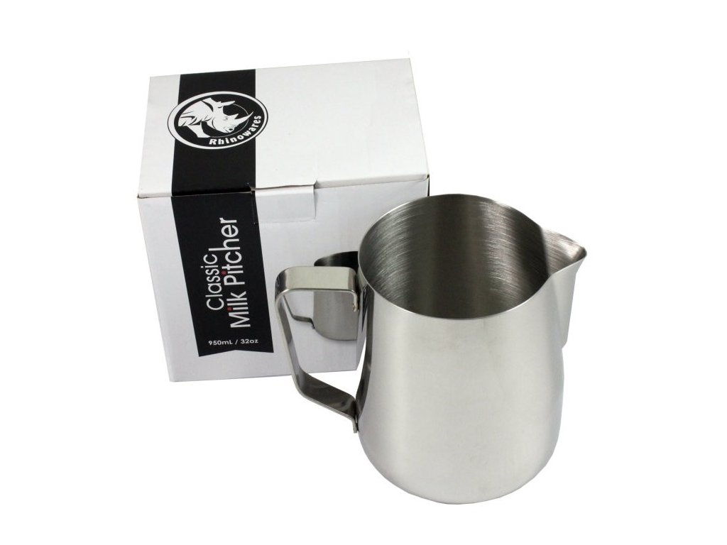 Nerezová profesionální konvička na napěnění mléka od výrobce Rhinowares. Konvička má dokonale tvarovaný zobáček, který oceníte zejména při tréningu latte artu.