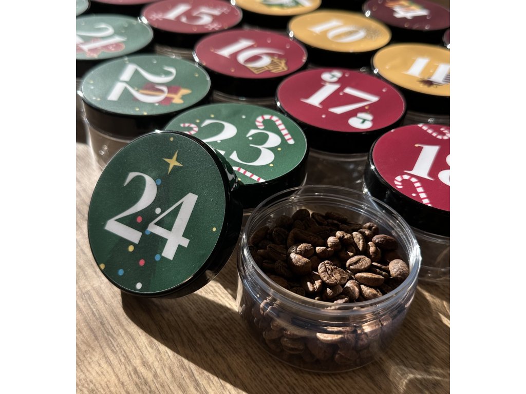 BaleníKáva je balena po 40 g na den, což odpovídá přípravě přibližně 667 ml kávy denně (při poměru 60 g kávy na 1 l vody). Káva je zabalena v plastových dózičkách, které můžete znovu využít. Třeba na vzorek kávy pro kamarády nebo do nich schovat drobnosti, pokud se vydáte někam na cesty. Víčka dóz perfektně těsní, aby káva vydržela krásně voňavá až do nového roku!