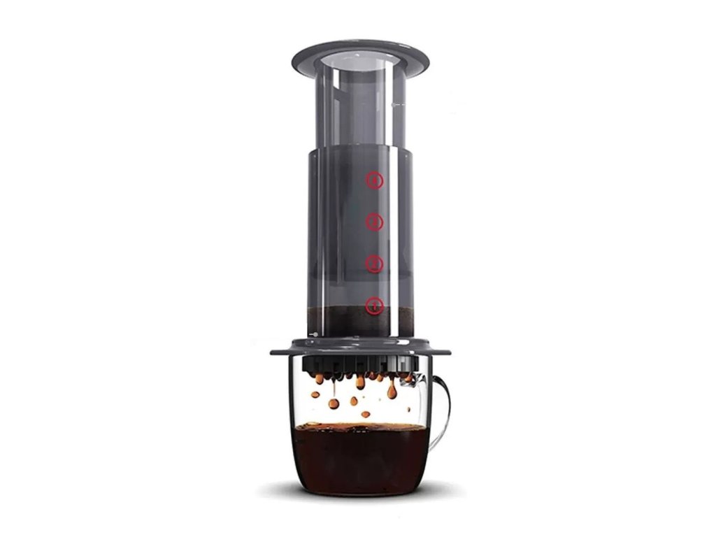 2. Inverzní metoda - Nasadíme píst a postavíme coffee press sítkem vzhůru. Do takto připraveného válce nasypte 15 - 18 g středně hrubě pomleté kávy, zalijeme 250 ml vody o teplotě 85-90 °C a pečlivě promícháme. Nasadíme sítko s propláchnutým filtrem a coffee press, nejlépe společně s konvičkou nebo šálkem, otočíme sítkem dolů. Kávu necháváme luhovat 1,5 minuty, poté pomalu přetlačíme do šálku.