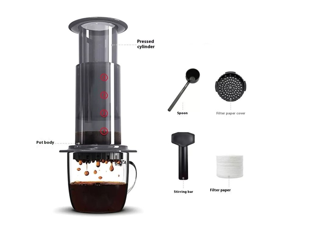 Coffee press pro přípravu kávy, šedá verze s červenými čísly.